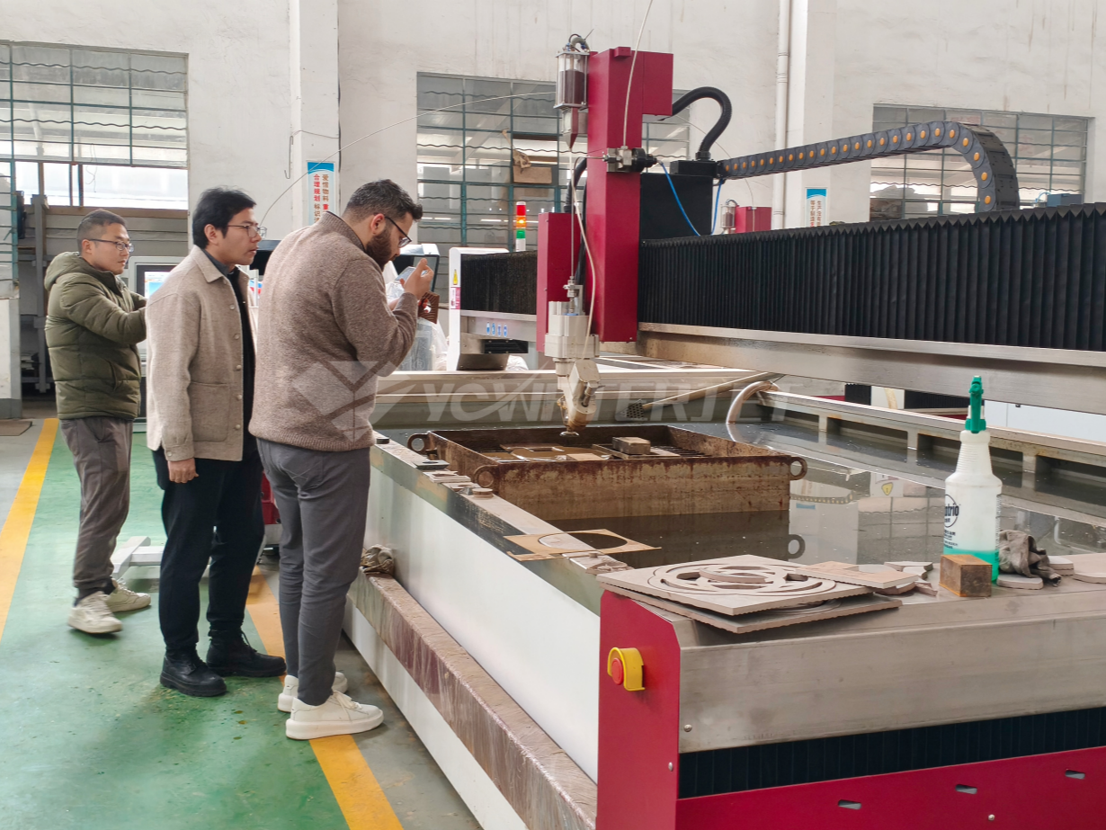 At the production workshop, the client observed live demonstrations of waterjet cutting equipment and witnessed firsthand the high-precision processing performance of the equipment on materials such as stone and metal. He expressed high recognition of the equipment’s stability, cutting efficiency, and customization capabilities. During the visit, the client engaged in in-depth discussions with YC WATERJET’s technical team regarding the optimization of core processes and solutions tailored to overseas application scenarios. The client also gained a detailed understanding of the company’s 25 years of technical expertise and innovative achievements.
